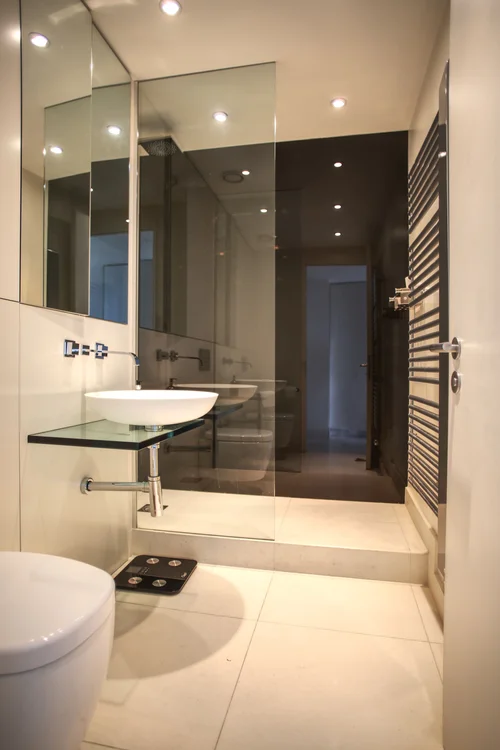 Access to the apartment was eventually achieved via a glass staircase positioned in the empty lift shaft above the service staircase. As the sandstone walls were not capable of taking any significant loading, the entire glass stair had to be suspended from the trusses from the loft level all the way down to the first floor.